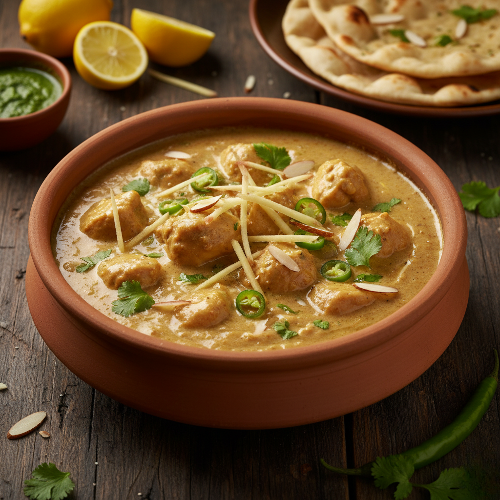 Succulent boneless chicken in a creamy, nutty almond-based gravy.