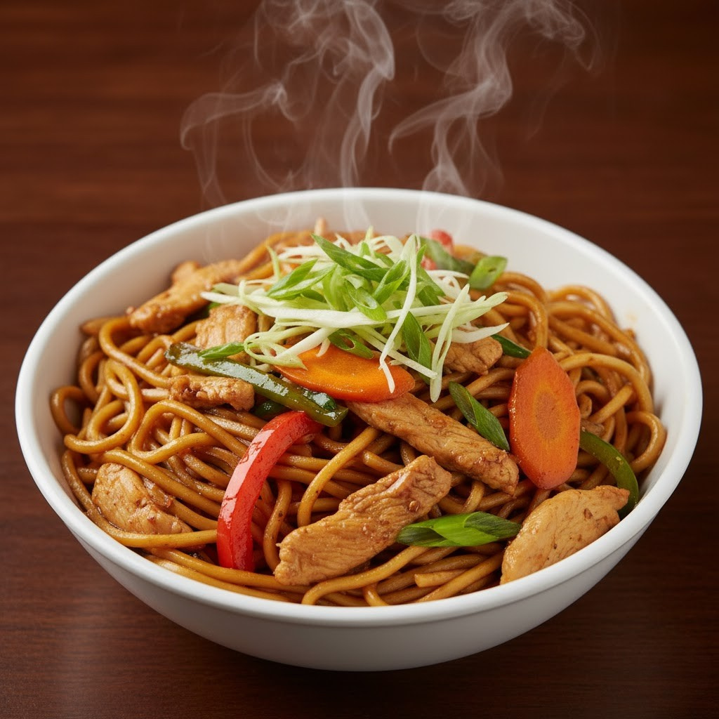 Stir-fried noodles tossed with tender chicken strips, colorful vegetables, and savory soy-based sauce — hot, flavorful, and satisfying.