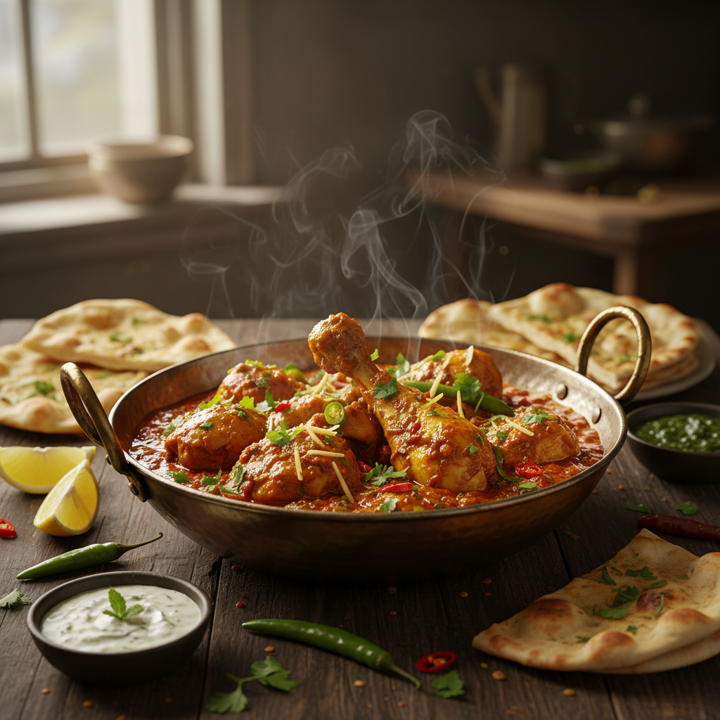 Village-style chicken cooked with fresh tomatoes, chilies, and bold desi spices.