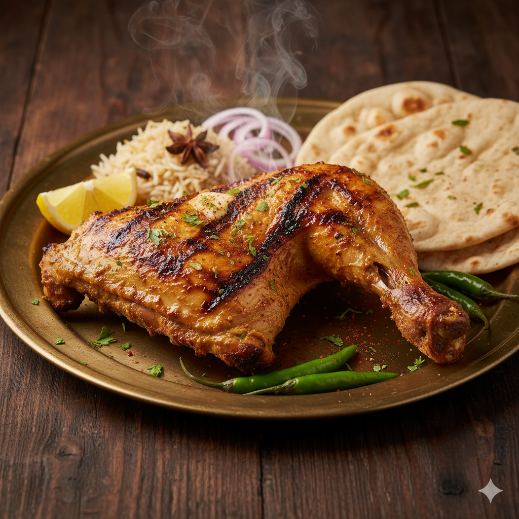 A perfectly grilled chicken leg, marinated with aromatic spices and cooked to juicy perfection. Served hot with naan, chutney, and lemon for a flavorful, smoky, and satisfying meal.