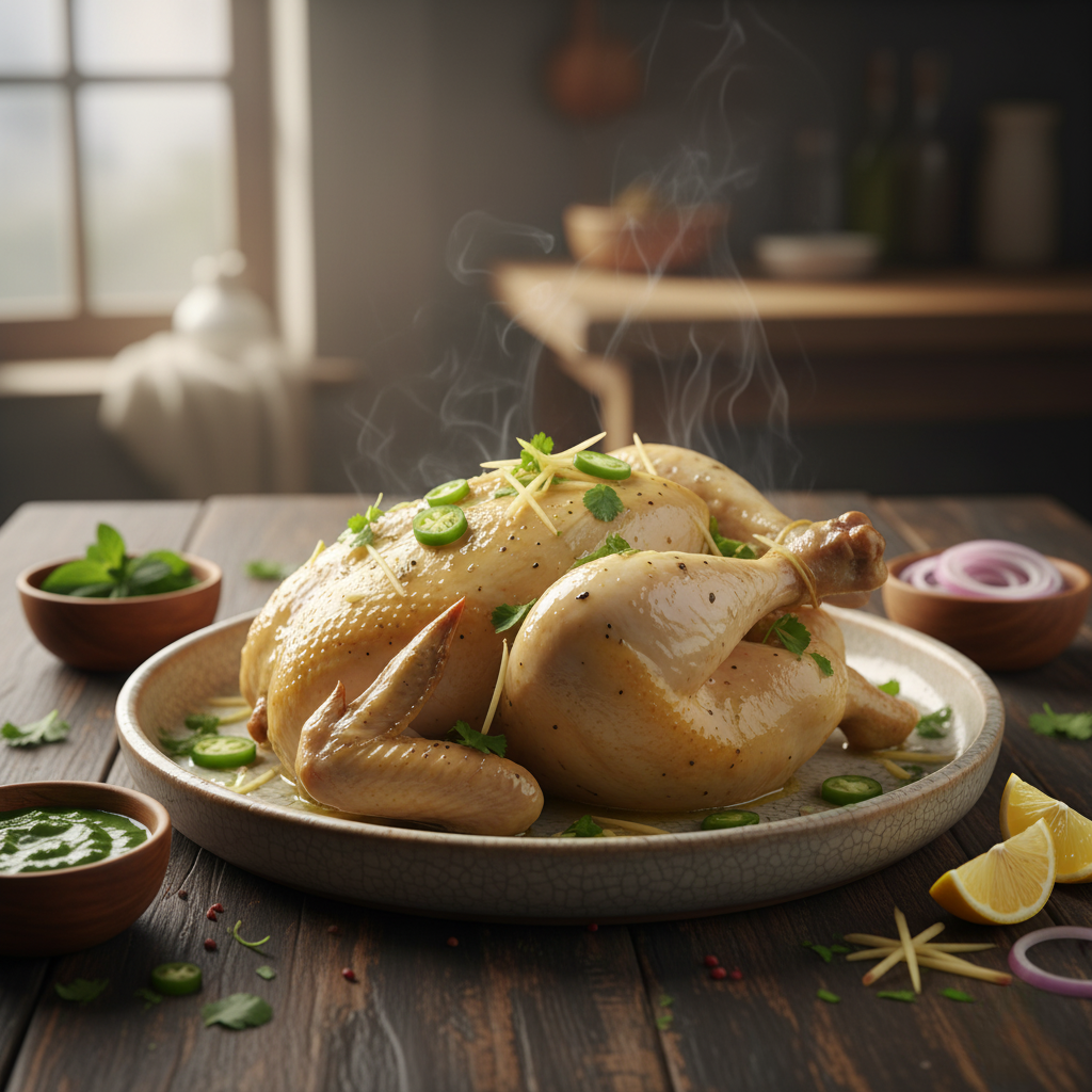Whole chicken delicately seasoned with aromatic spices and steam-cooked to juicy perfection. A light, healthy, and flavorful dish that preserves natural taste and tenderness in every bite.