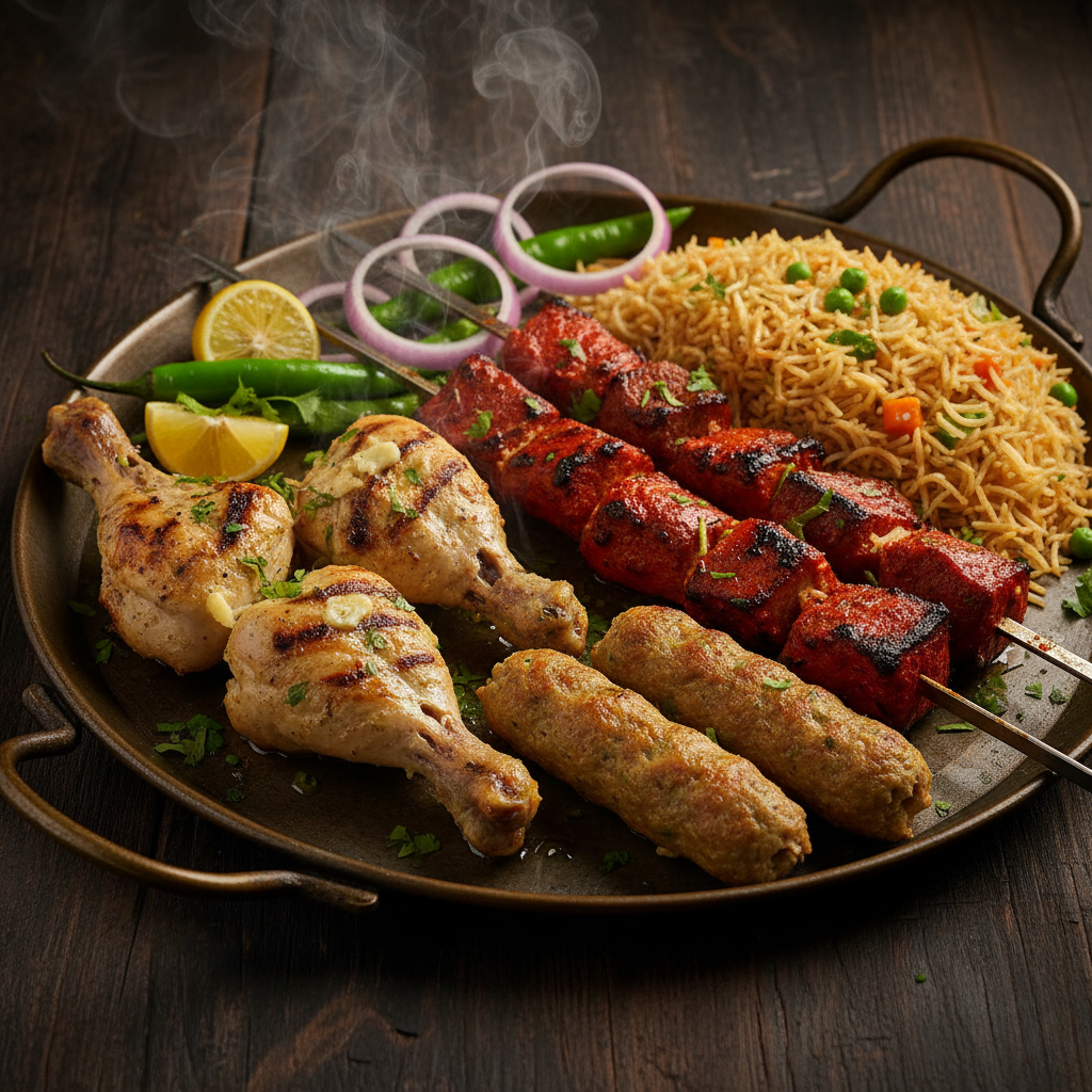 generous assortment of smoky grilled favorites — juicy malai drumsticks, spicy tikka boti, and tender seekh kababs — served with aromatic rice, fresh onions, lemon, and chutney. A perfect feast for BBQ lovers craving variety and rich, bold flavors.