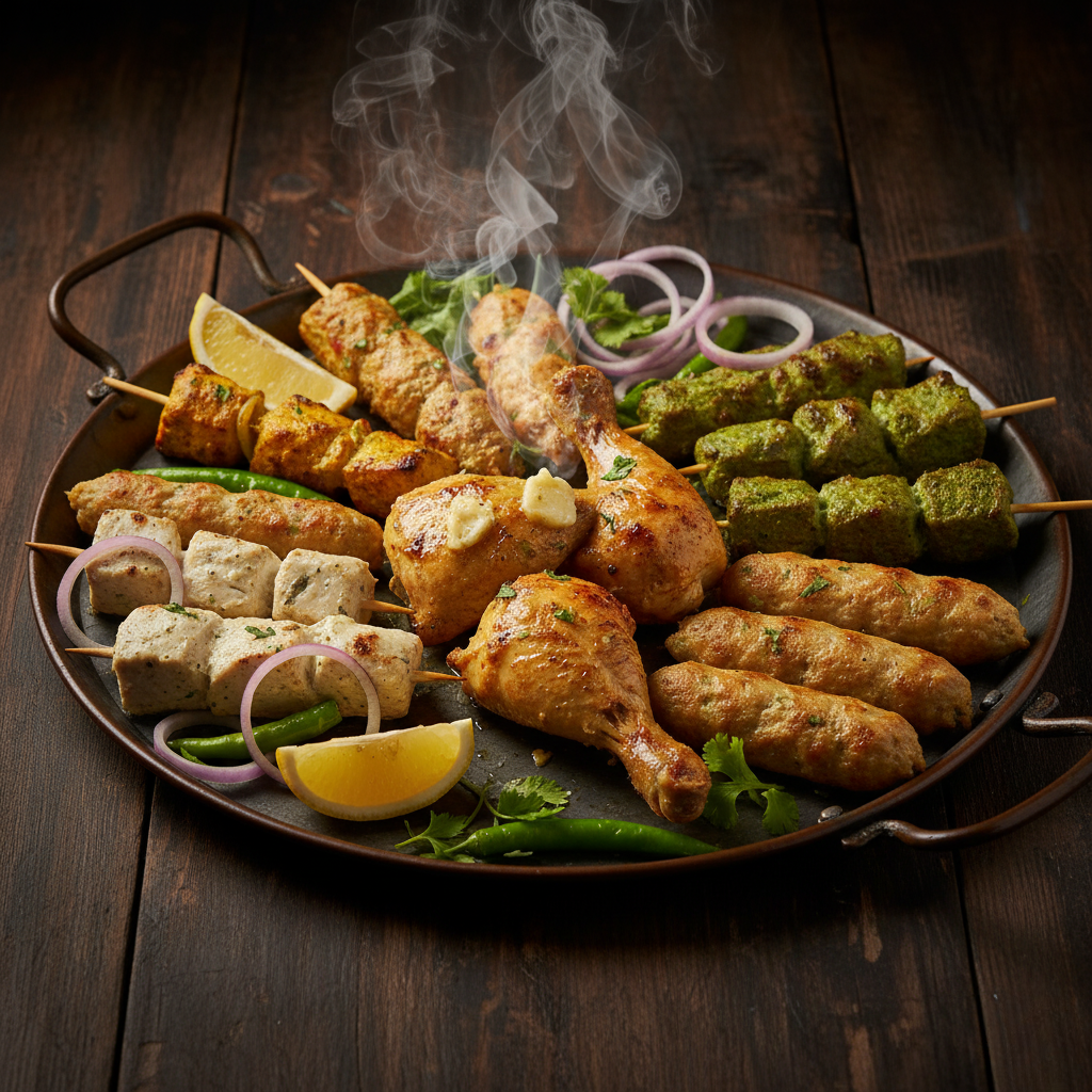 A premium assortment of smoky grilled favorites — malai drumsticks, spicy seekh kababs, reshmi botis, haryali tikka, and white malai boti — all served sizzling hot with lemon, onions, and chutney. A perfect feast offering the full spectrum of BBQ flavors in one grand platter.