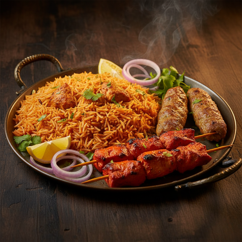 A flavorful serving of spicy masala rice paired with succulent chicken tikka boti and juicy seekh kababs. Served with lemon, onions, and chutney, this platter delivers the perfect combination of smoky BBQ taste and hearty rice goodness.