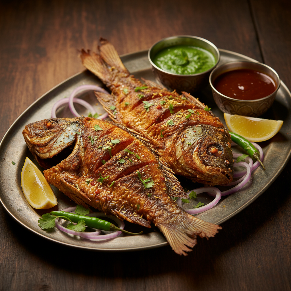 Crispy golden fried whole fish marinated in zesty spices — crunchy on the outside, tender and flavorful inside.